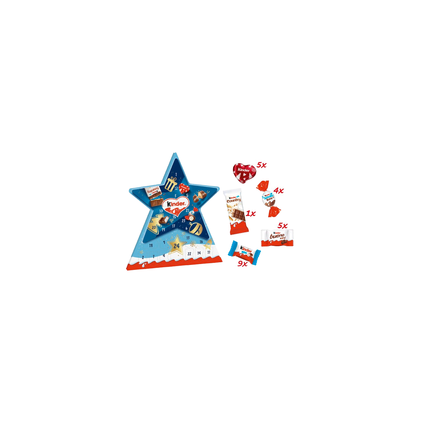 Celebra la magia de la Navidad con el encantador Calendario de Estrella de Kinder, una deliciosa forma de contar los días hasta Nochebuena. Su diseño en forma de estrella decorativa convierte este calendario en un detalle perfecto para regalar o disfrutar en familia.