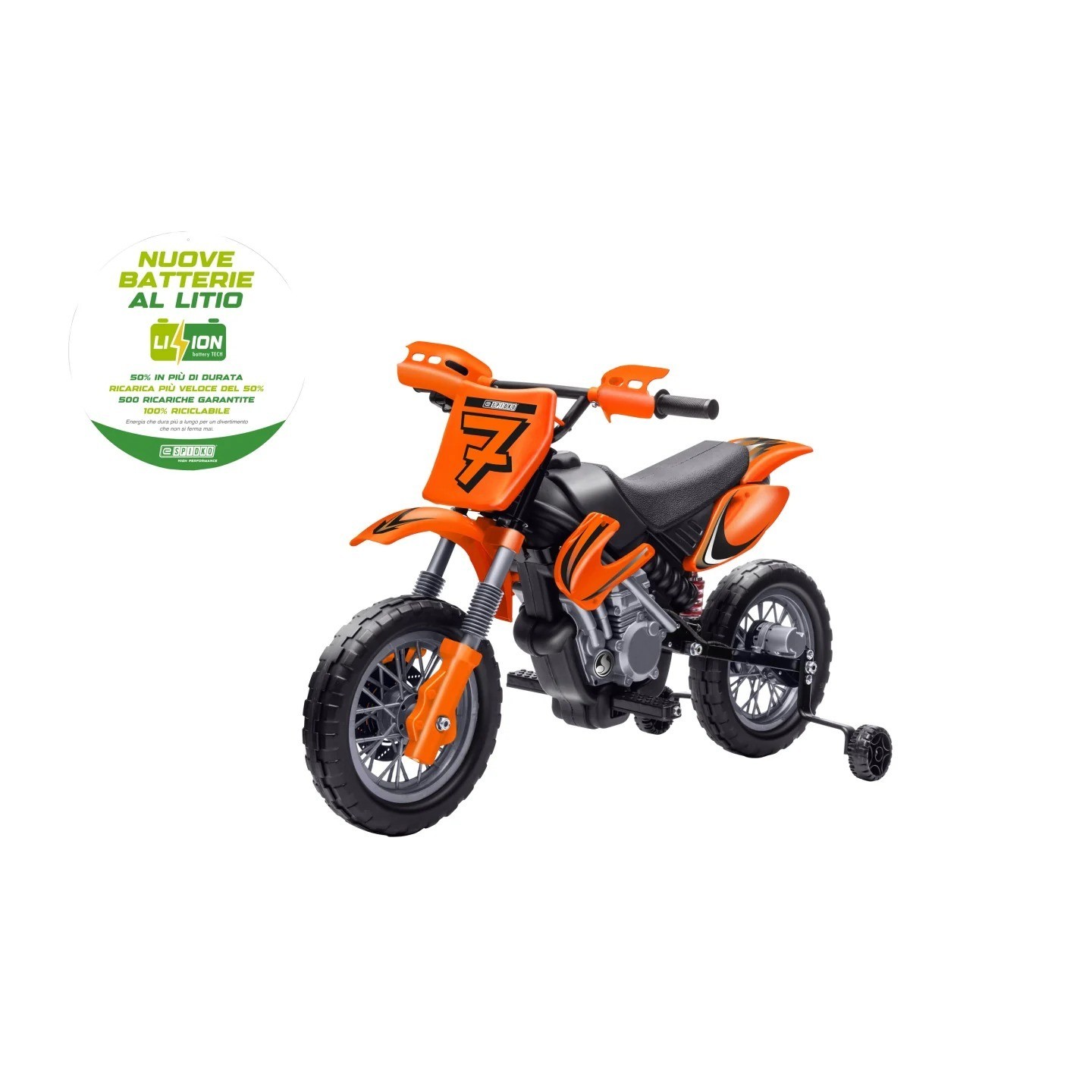 Moto eléctrica infantil tipo cross color naranja con batería de litio 12V 4,5Ah. Potente, segura y perfecta para pequeños aventureros.