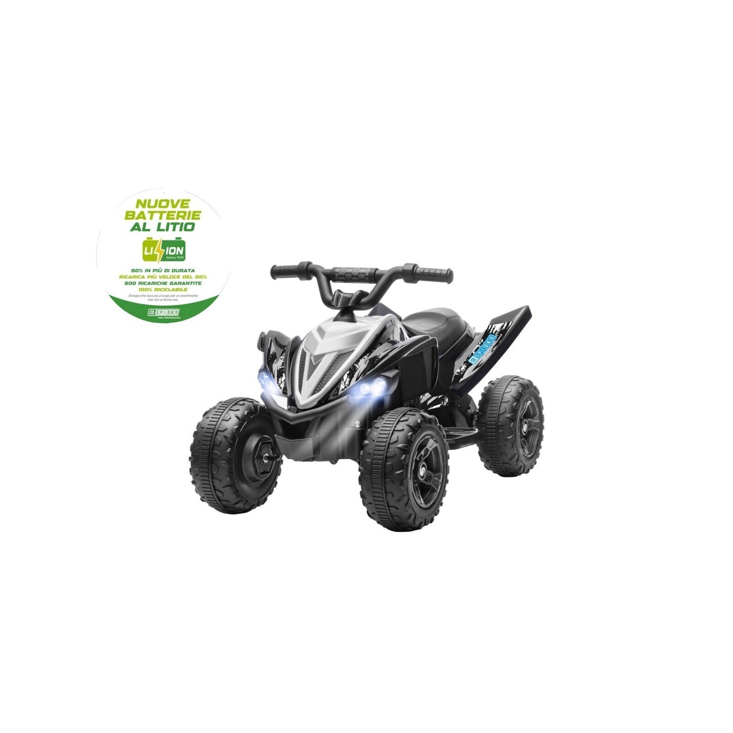 Quad eléctrico infantil negro con batería de litio 12V 4,5Ah. Ideal para pequeños aventureros, combina potencia, seguridad y diversión al aire libre.