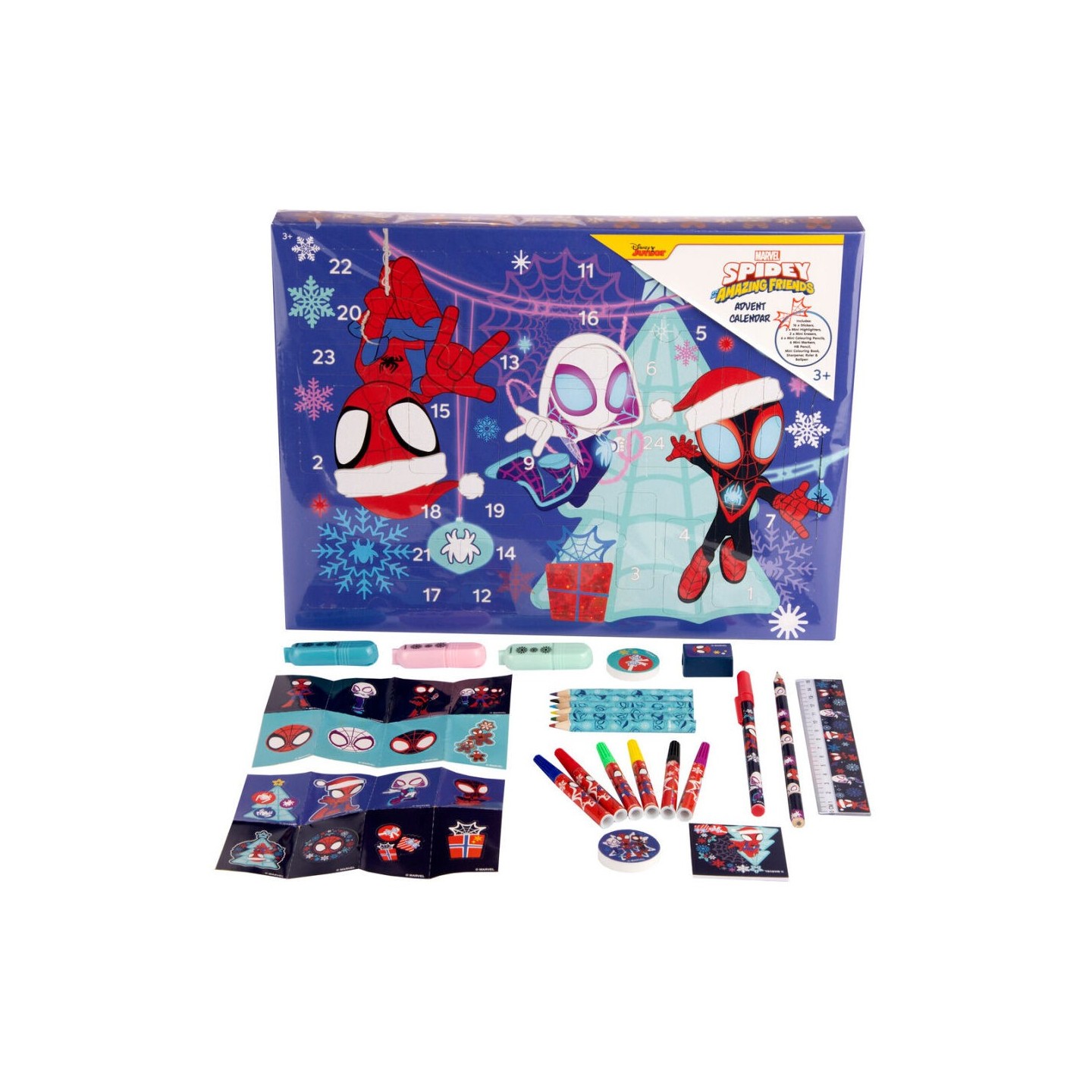 Calendario de Adviento de Spidey con sorpresas de papelería y material escolar, ideal para los pequeños fans del superhéroe.