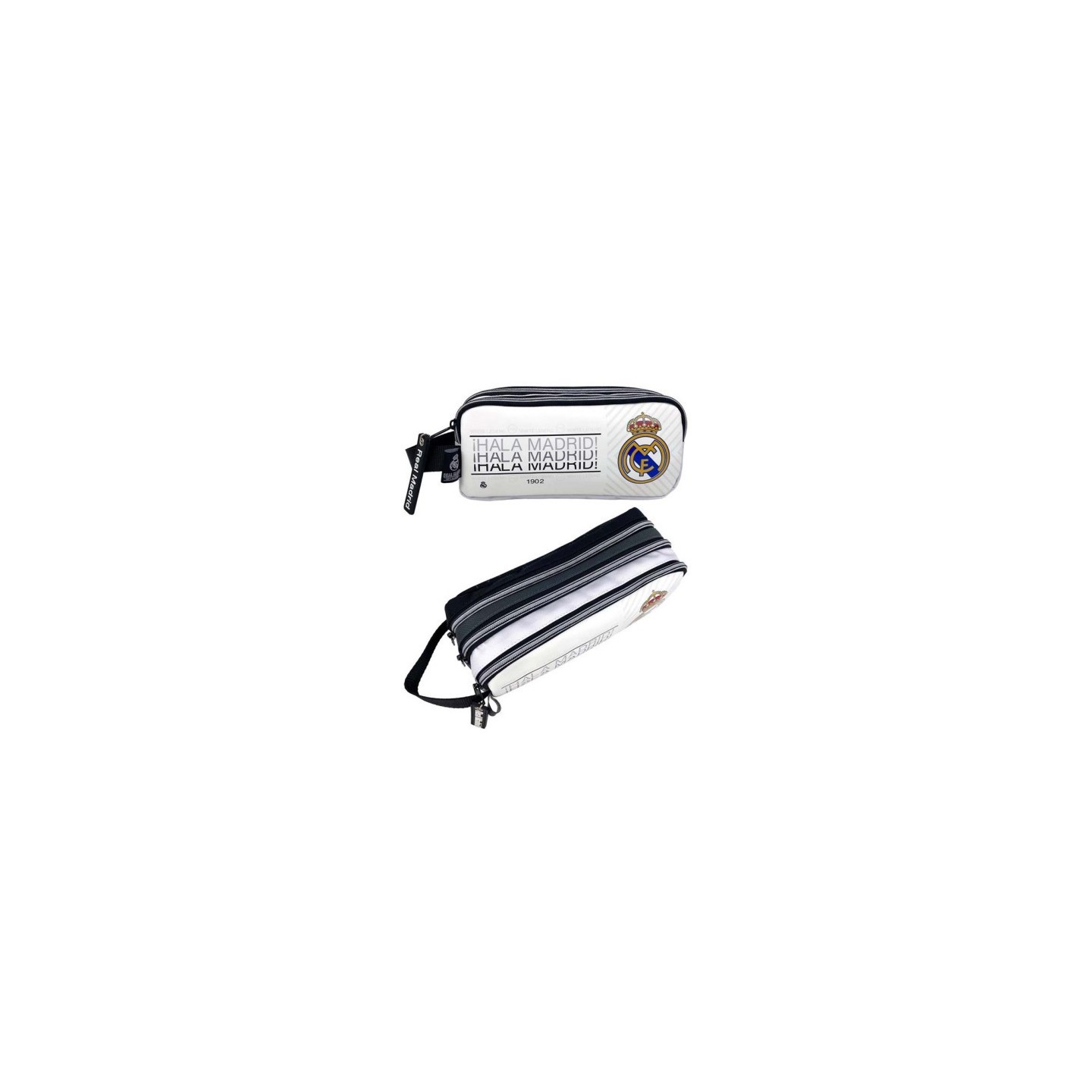 El Portatodo Triple Real Madrid - Hala Madrid es perfecto para los verdaderos fans del club blanco. Con tres compartimentos amplios y cremalleras resistentes, permite organizar lápices, bolígrafos, rotuladores y más. Fabricado con materiales duraderos y con el diseño oficial “Hala Madrid”, es ideal para la escuela o para llevar siempre el espíritu madridista contigo.
