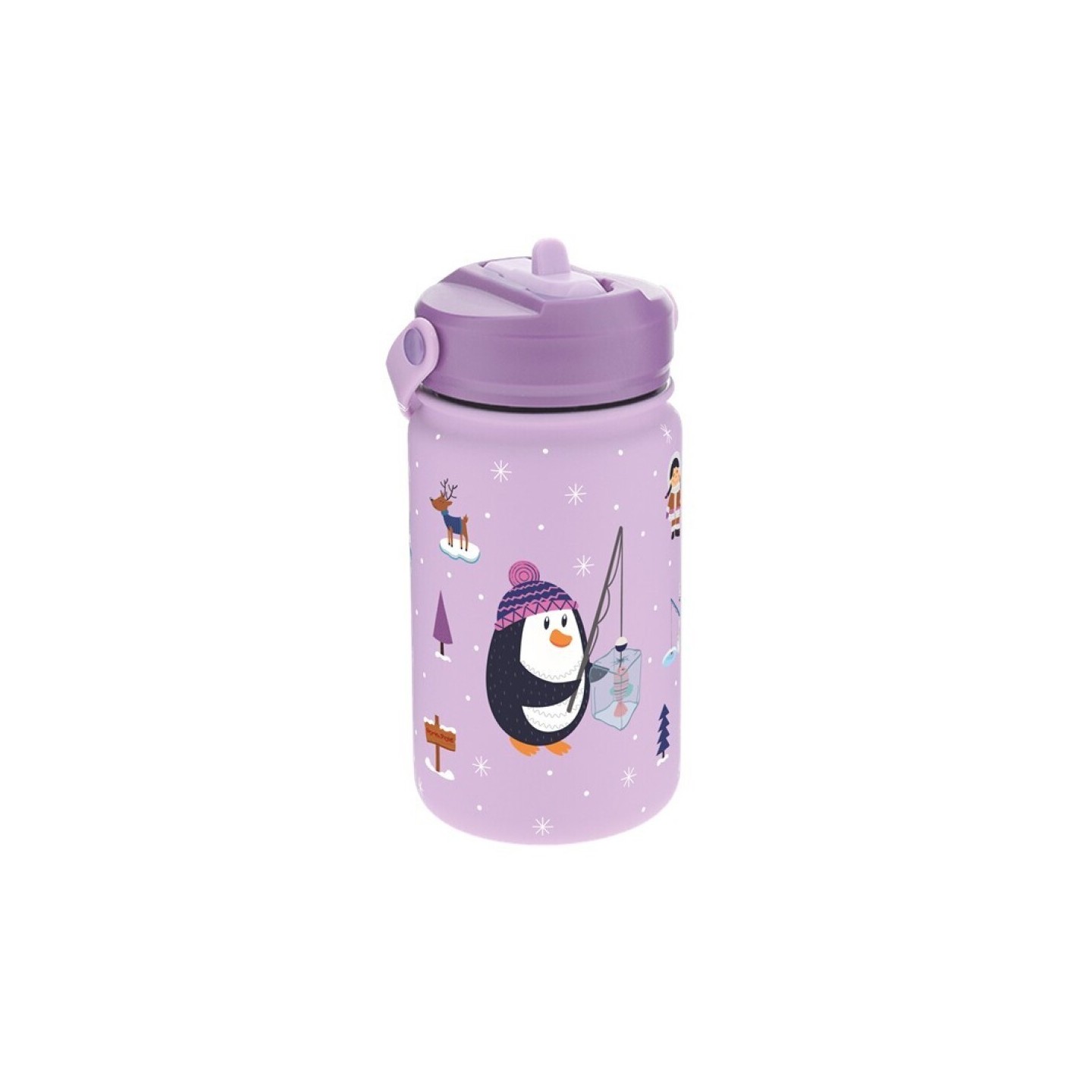 Botella térmica infantil de 330 ml en color Lilac con un simpático diseño de pingüinos polares. Incluye adaptador especial para niños, fácil de usar y transportar. Perfecta para mantener bebidas frías o calientes durante todo el día.
