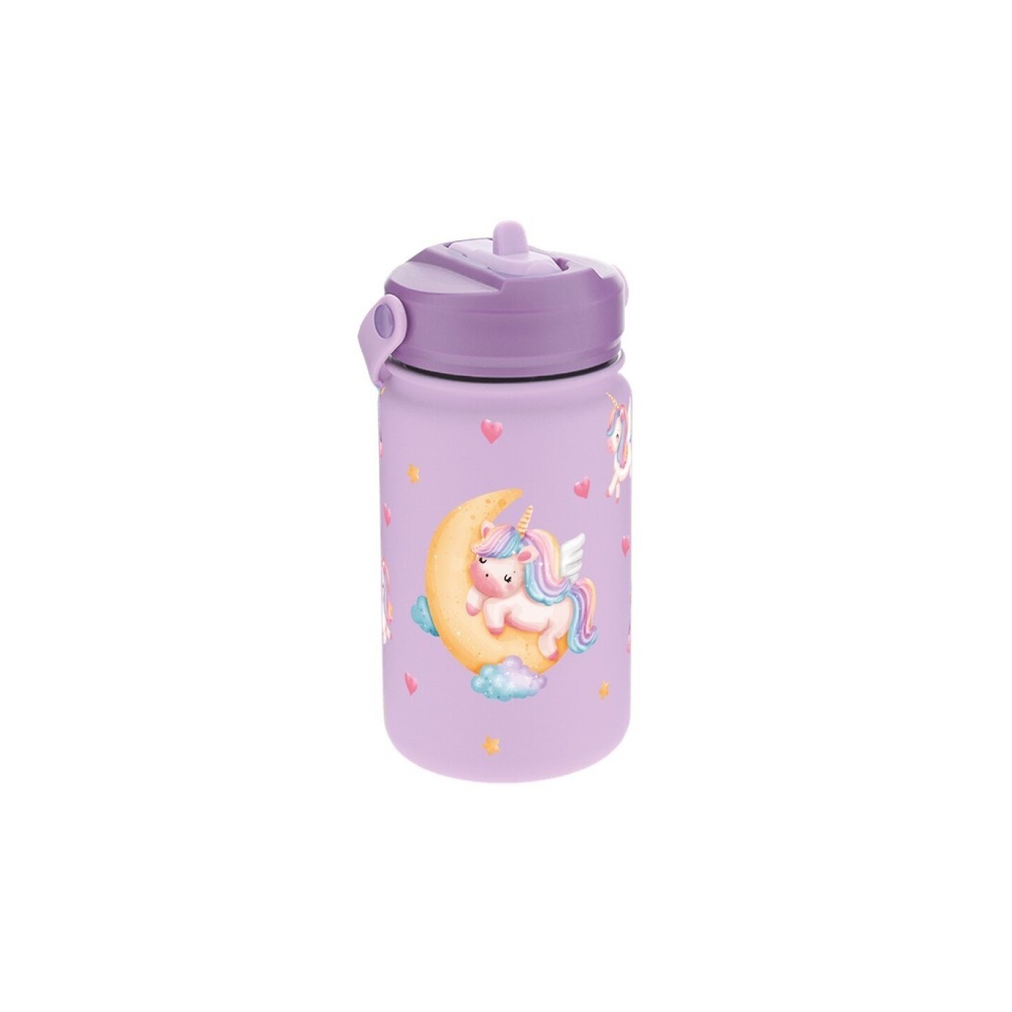 Botella térmica de 330 ml con adaptador infantil y diseño “Moon Unicorn”. Mantiene las bebidas frías o calientes durante horas, ideal para el colegio o excursiones.