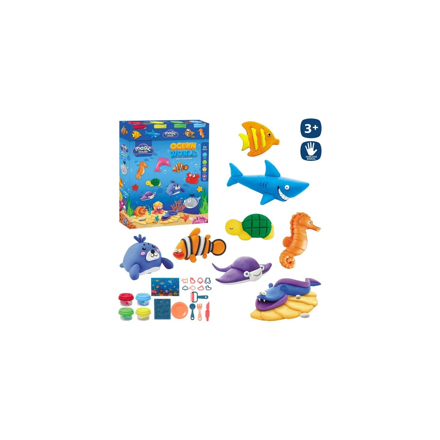 Este set de 4 botes de plastilina Animal Marino permite a los niños crear figuras y escenas inspiradas en el mundo submarino. Incluye plastilina suave y moldeable, acompañada de accesorios para modelar, fomentando la imaginación, la coordinación mano-ojo y el juego creativo. Perfecto para actividades en casa, colegios o talleres educativos. Seguro y reutilizable, ideal para largas horas de diversión.