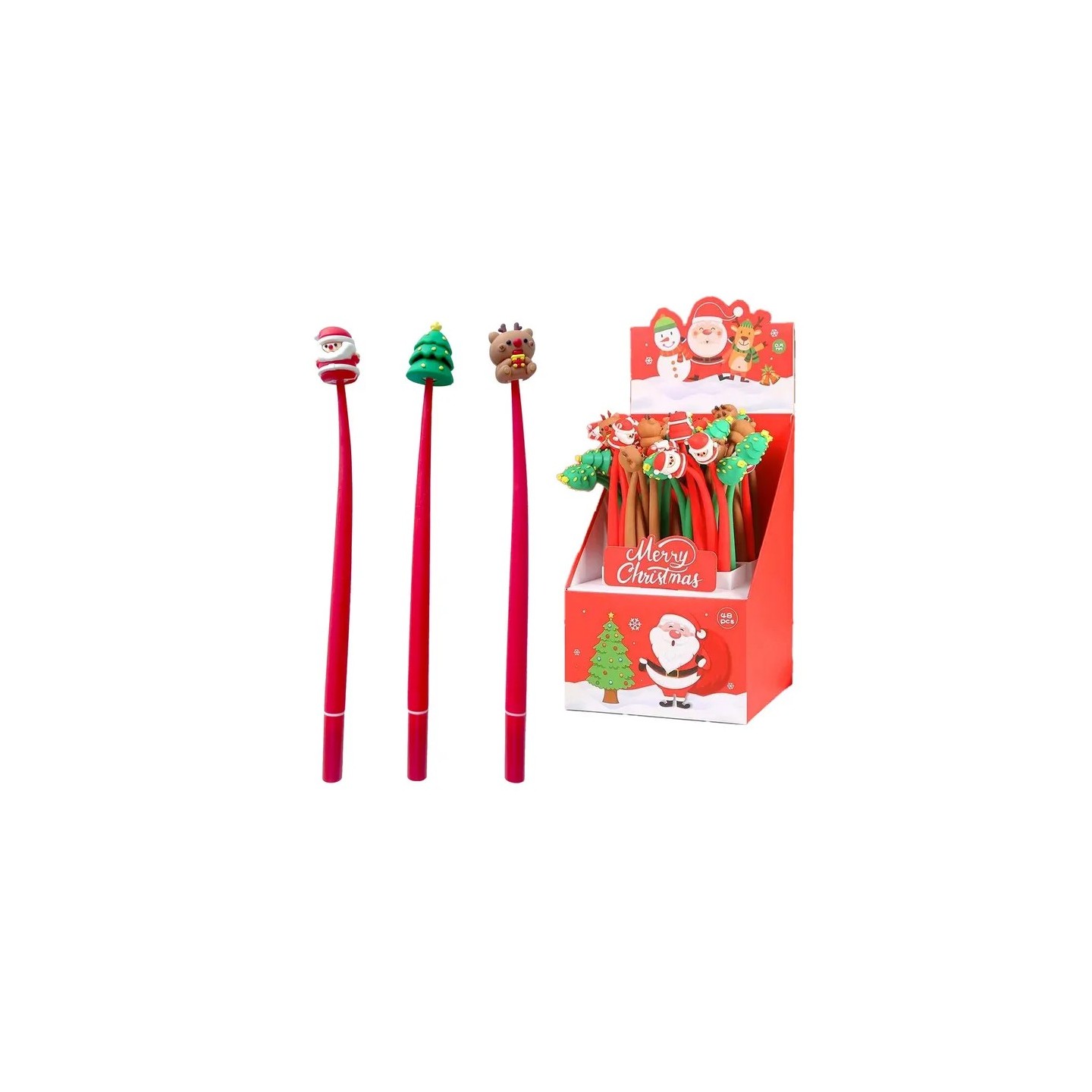 Bolígrafo de plástico con figuras navideñas, 3 modelos disponibles, tamaño 2 x 2 x 21 cm. Ideal como detalle o regalo festivo.