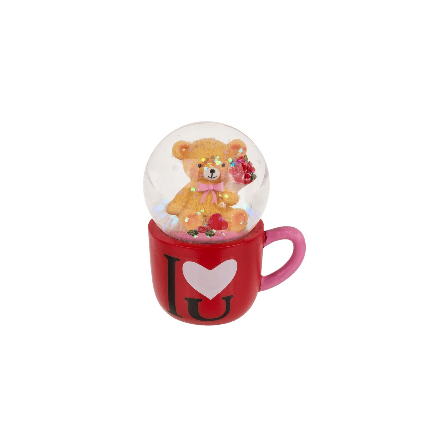 Bola decorativa de poliresina con figura de oso en taza y el mensaje “I love you”, de aproximadamente 7 × 6 cm. Un detalle romántico y decorativo lleno de ternura.