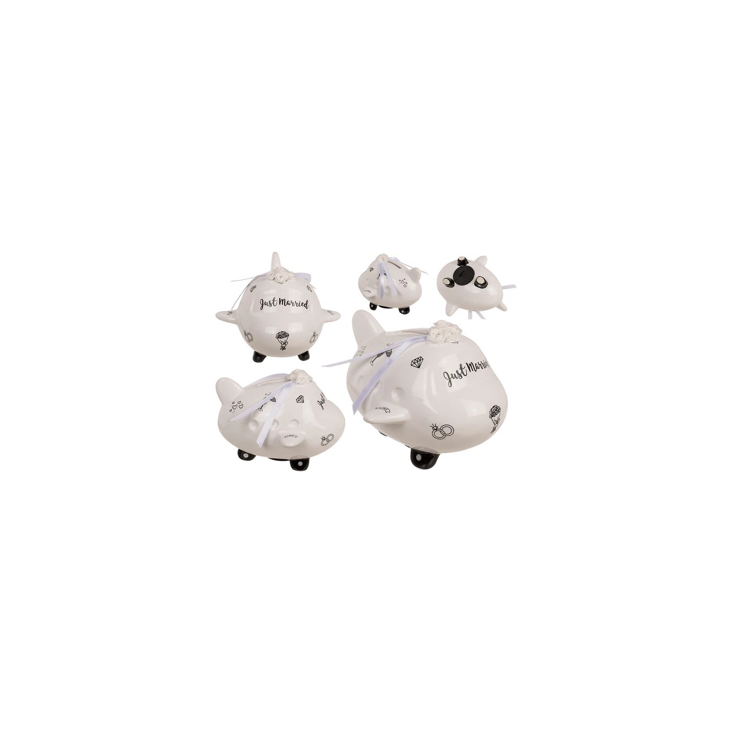Dale un toque único a la decoración de los recién casados con nuestra hucha en forma de avión "Recién Casados". Con un tamaño aproximado de 14 x 12 x 9,5 cm, esta hucha es un regalo perfecto para bodas, simbolizando el inicio de un emocionante viaje en pareja. Hecha de cerámica de alta calidad, tiene un diseño encantador y elegante que captura la esencia del amor y la aventura compartida.