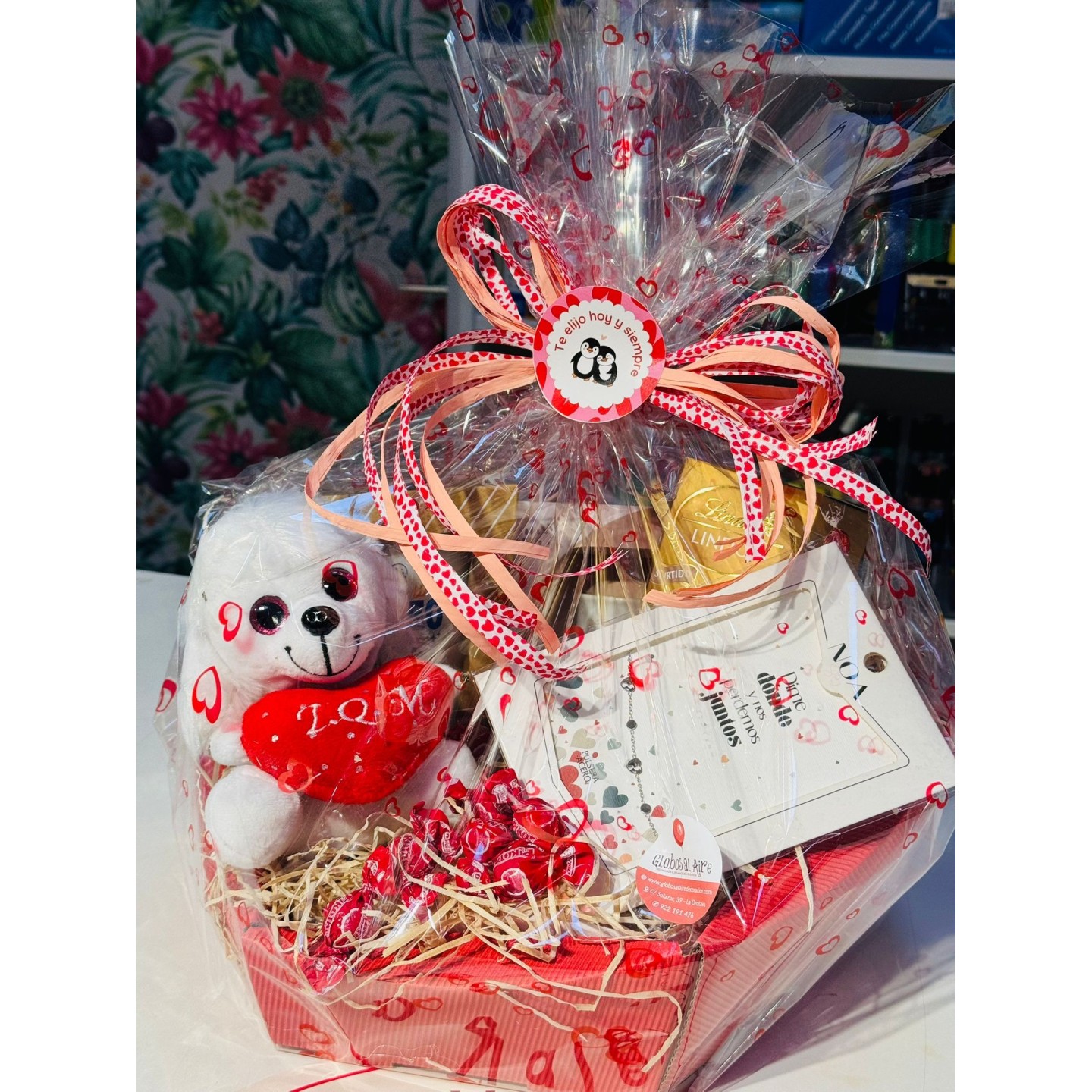 Incluye una vela decorativa perfecta para ambientar momentos especiales, una taza mini encantadora, un peluche suave que transmite amor, una pulsera de acero elegante y duradera, y un delicioso surtido de bombones para endulzar la ocasión.
