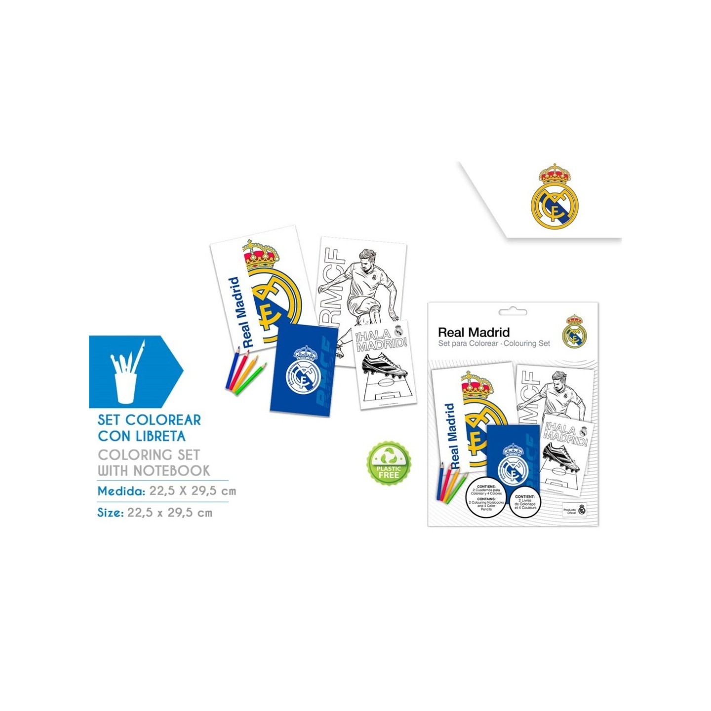 Set de colorear que incluye notebook con diseño del Real Madrid, ideal para actividades creativas y escolares de los aficionados al club.