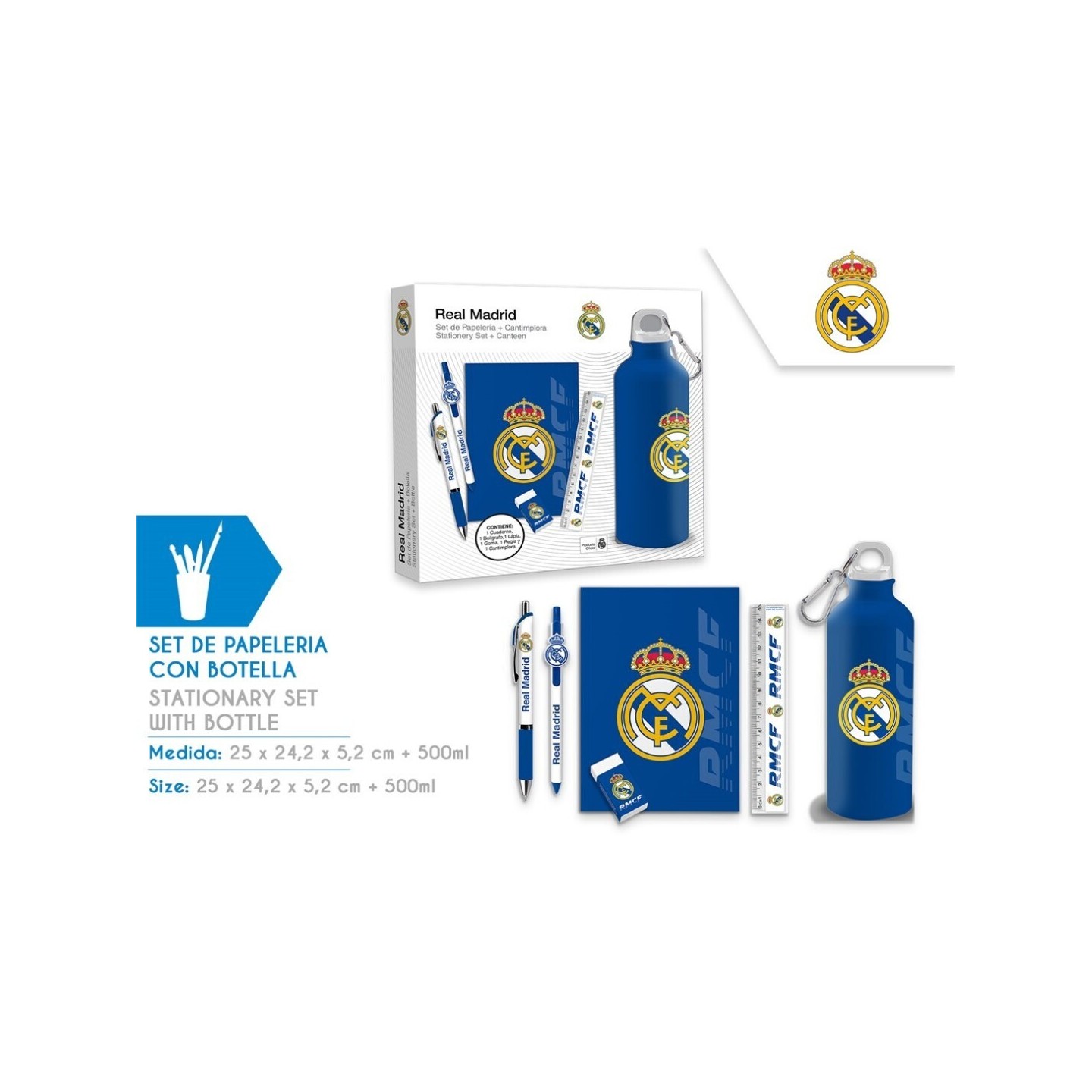 Set de papelería completo con artículos escolares y botella de 650ml decorada con el escudo y colores del Real Madrid. Incluye elementos prácticos para la escuela y actividades diarias, combinando funcionalidad y estilo para los aficionados del club. Perfecto como regalo o para uso personal.