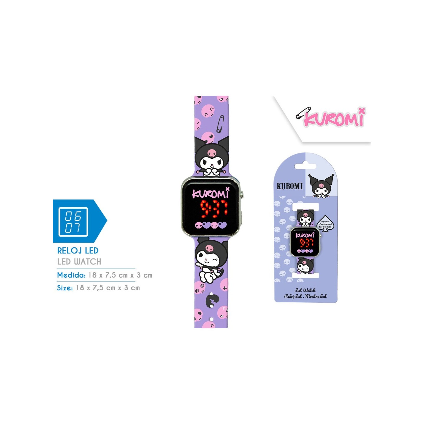 Reloj con pantalla LED decorado con Kuromi, mostrando la hora de manera clara y moderna. Ligero y cómodo para el uso diario, combina estilo y practicidad, siendo perfecto para niños, adolescentes y seguidores del personaje. Ideal como accesorio de moda o regalo.