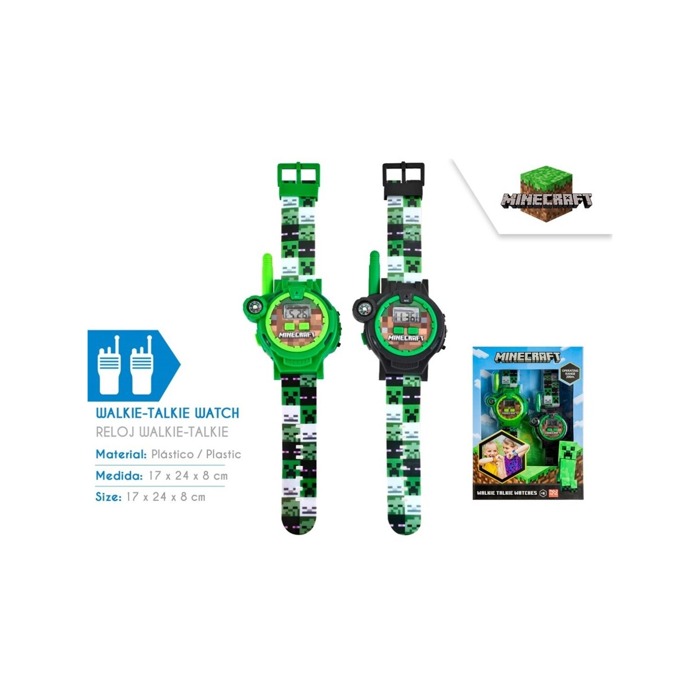 Este walkie talkie y reloj 2 en 1 de Minecraft combina comunicación y estilo en un solo dispositivo. Diseñado especialmente para niños, permite hablar a distancia mientras luce un reloj con temática del popular videojuego. Es perfecto para juegos al aire libre, aventuras con amigos o como regalo para fans de Minecraft.