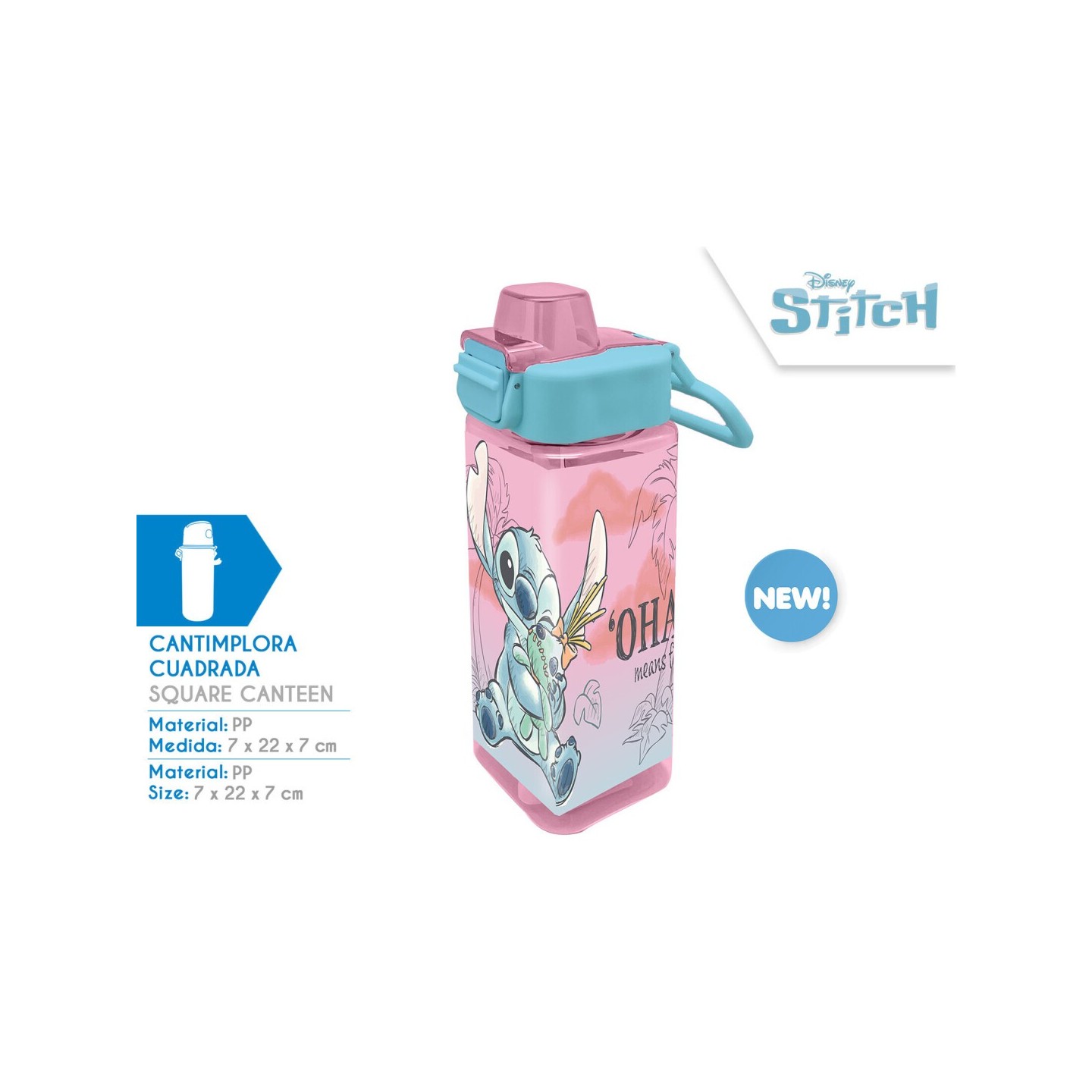 La botella PP cuadrada Stitch está fabricada en polipropileno (PP), un material duradero, ligero y seguro para bebidas frías. Su forma cuadrada facilita un mejor aprovechamiento del espacio en mochilas o bolsas y evita que ruede cuando se coloca sobre superficies planas.