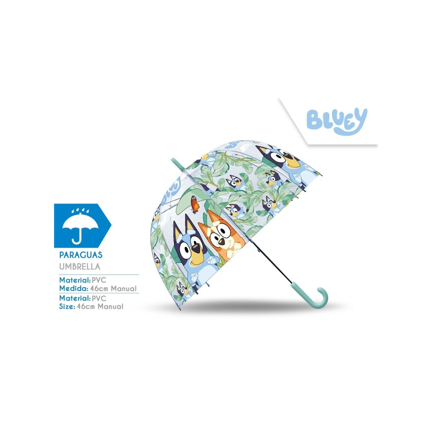 El paraguas transparente campana 46 cm Bluey está fabricado con materiales resistentes y seguros, con varillas reforzadas para soportar el viento y lluvia ligera. Su diseño tipo campana protege mejor la cabeza y los hombros de los niños, mientras que la transparencia permite ver a través del paraguas durante su uso.