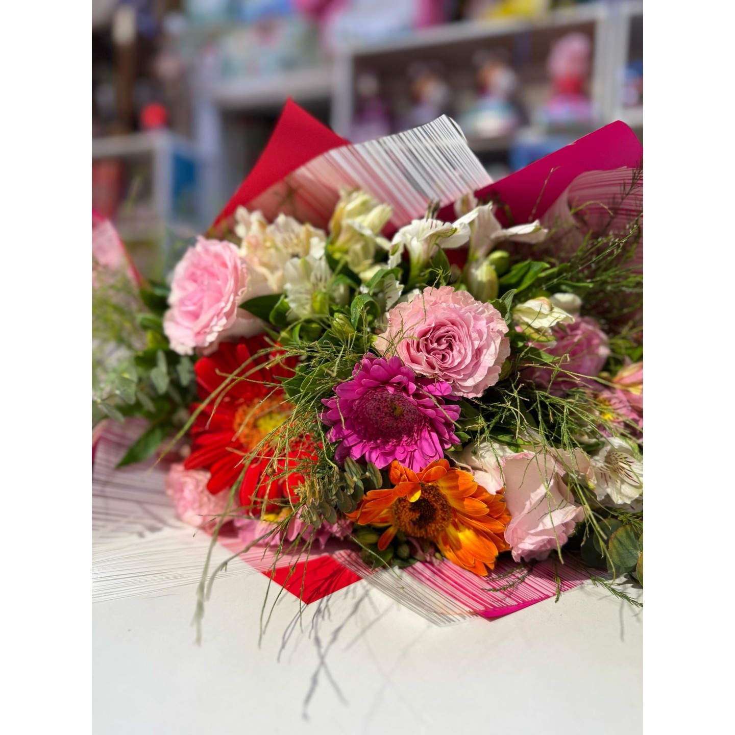 Este precioso ramo de flores está compuesto por una cuidada combinación de rosas y gerberas en tonos variados, creando una armonía visual vibrante y delicada. Las rosas simbolizan amor, ternura y respeto, mientras que las gerberas aportan alegría y energía con su presencia radiante.