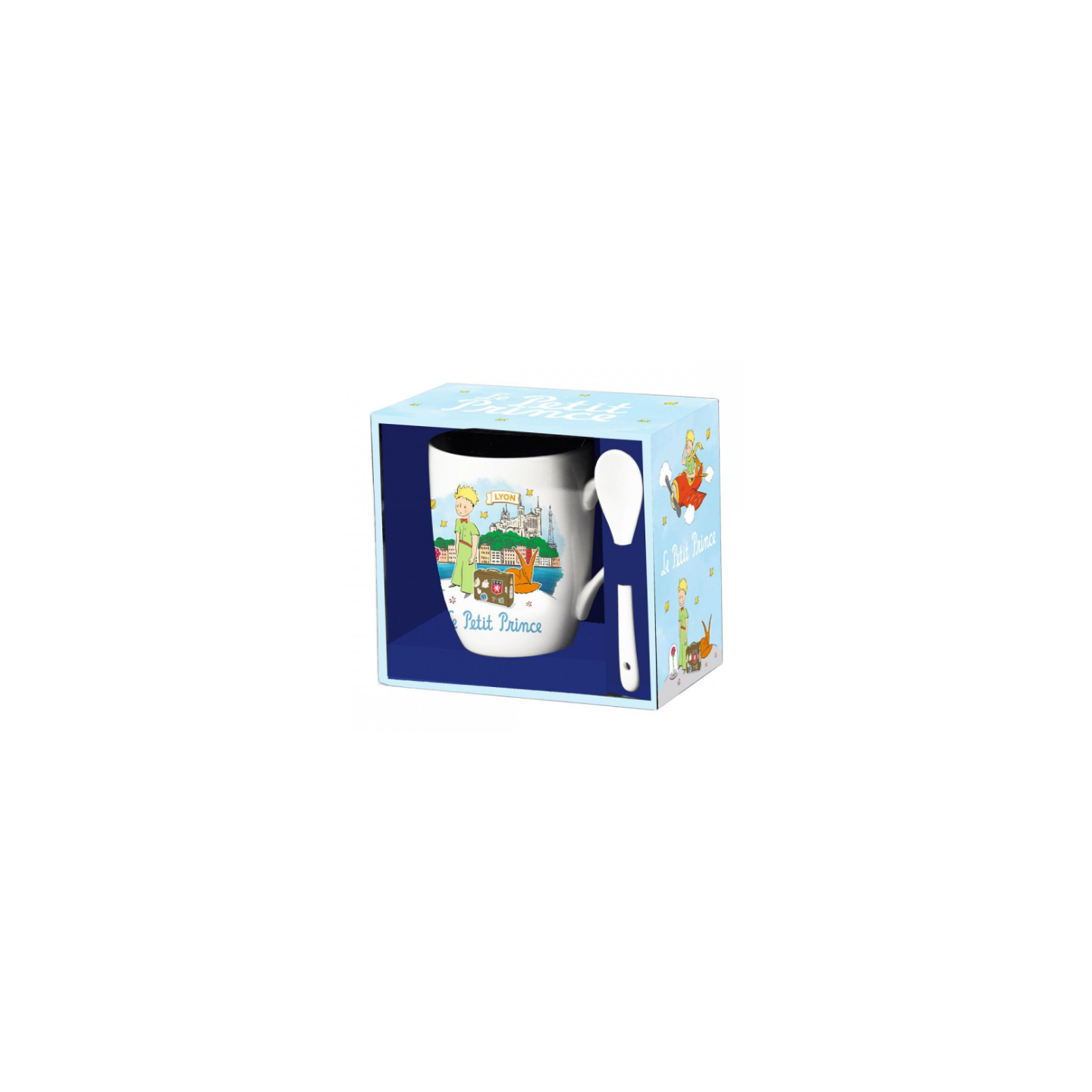 Taza de cerámica con diseño exclusivo de Lyon, acompañada de una cucharita a juego, ideal para disfrutar de tus bebidas favoritas con estilo y un toque de elegancia.