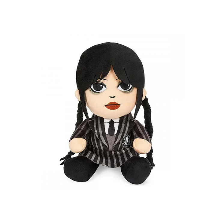 Este peluche de Mercredi Addams combina lo siniestro y lo adorable en una sola pieza. Con su característico vestido oscuro, trenzas perfectamente peinadas y una expresión seria pero entrañable, este peluche es el regalo perfecto para fans de la familia Addams o de la serie Wednesday.